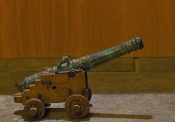 Modell av kanon från 1680 dekorerad med Riksvapnet. Tillverkad i brons med eklavett.